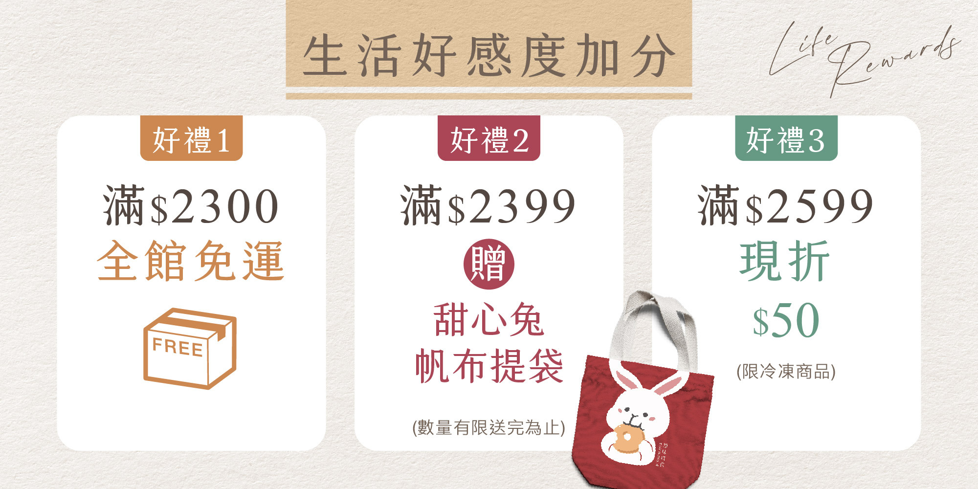 1.單筆訂單折扣後消費滿額,即可獲得迎新好禮,系統自動依消費金額擇優一項贈送,數量有限,送完為止,恕不累贈 e.g.實際消費滿1999即可獲得起司貝果1顆