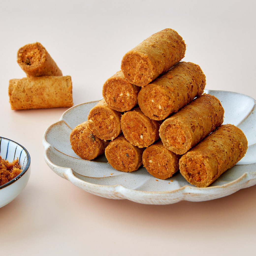 使用頂級台灣溫體豬肉,40年經驗慢工文火烘炒8小時,金黃澎鬆、口感酥軟,盡享樸實厚味,與酥脆蛋捲最為相配。