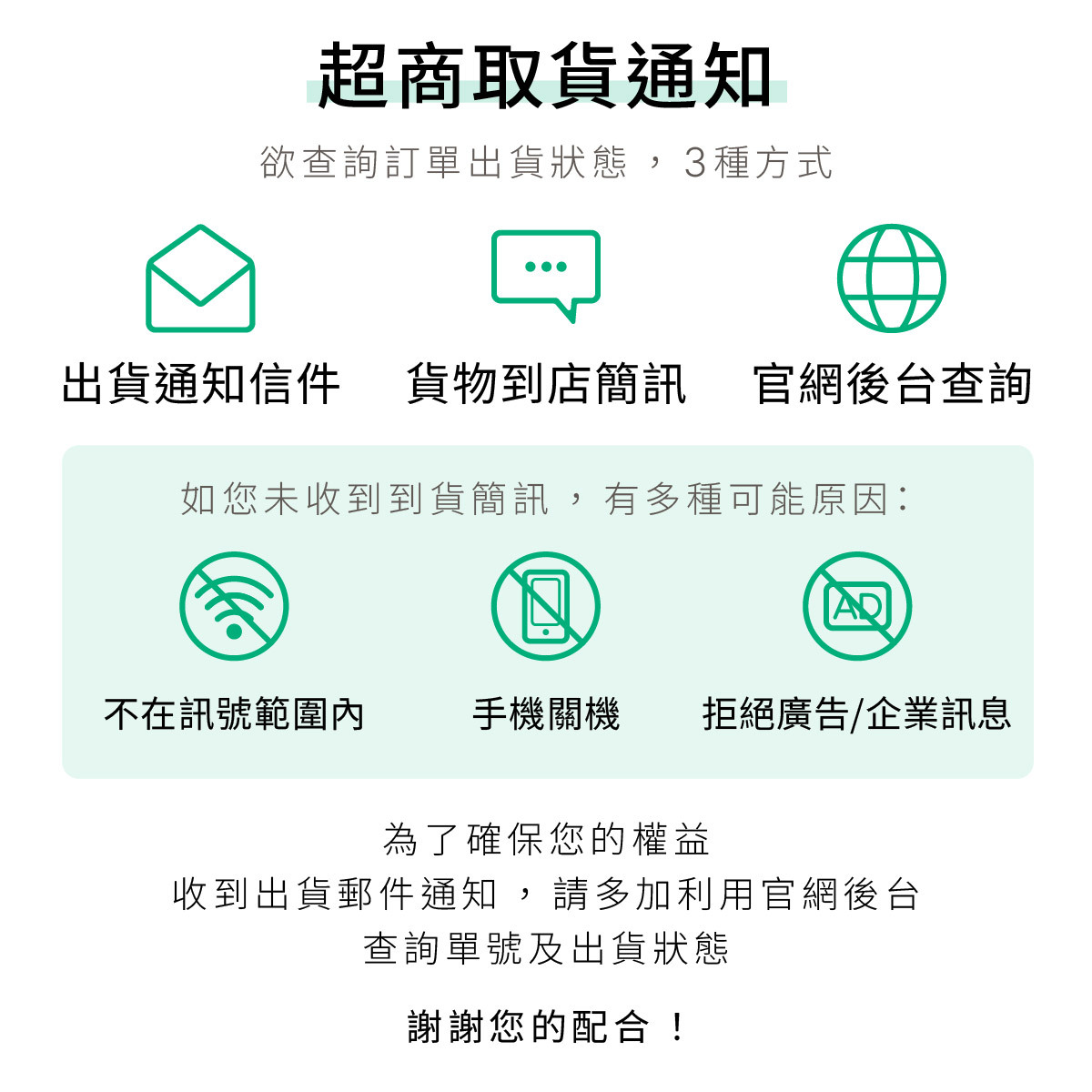 •若為超商取件,請確認是否留下正確取件人資訊,超商取件需核對證件,於收到簡訊後請於5天內取件完成