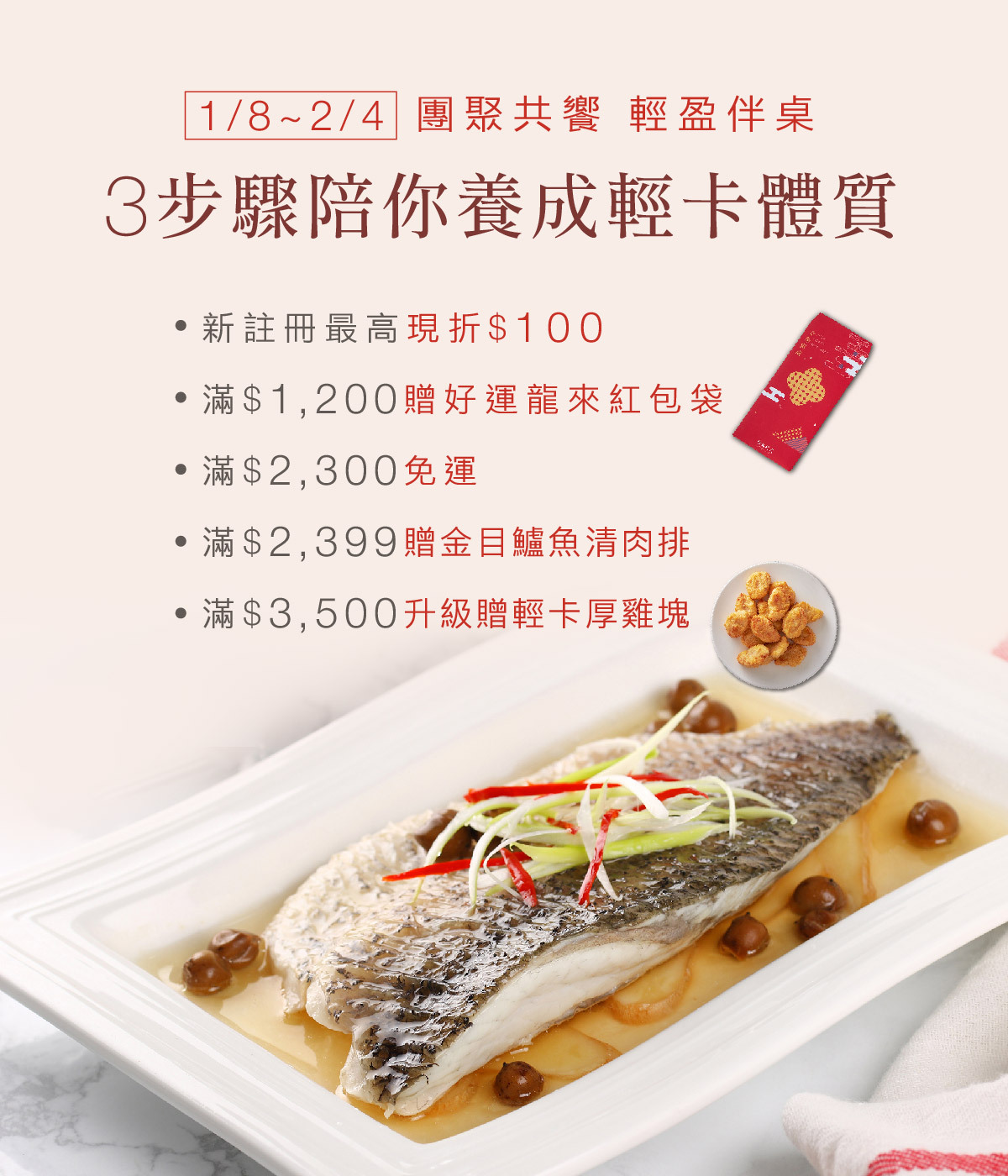 4.折抵後滿$2,399再贈金目鱸魚排,數量有限,送完為止,系統未顯示贈禮即表示已完贈,恕不另行通知