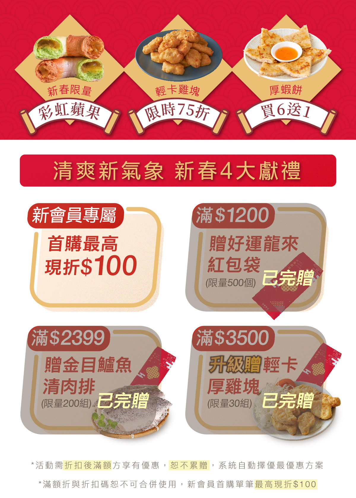 3.折抵後滿$1,200贈好運龍來紅包袋1入,數量有限,送完為止,系統未顯示贈禮即表示已完贈,恕不另行通知