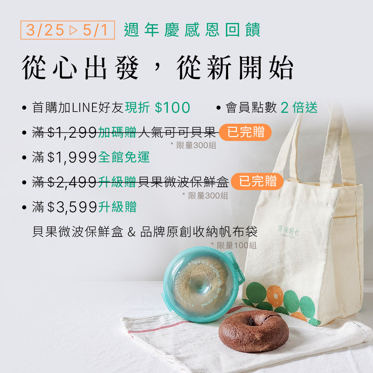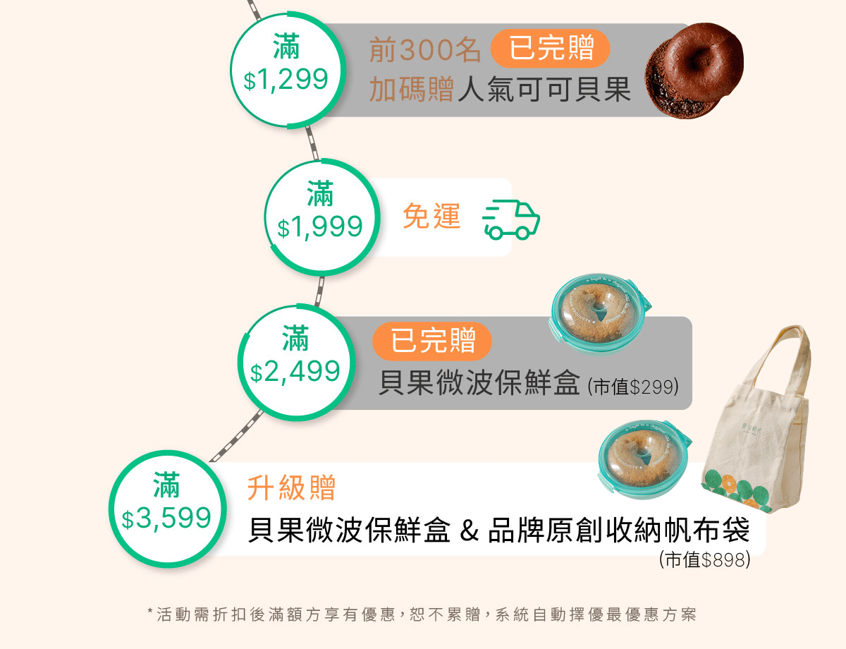5.折抵後滿$3599升級贈開啟貝果微波保鮮盒與品牌原創收納帆布袋,數量有限,送完為止,系統未顯示贈禮即表示已完贈,恕不另行通知