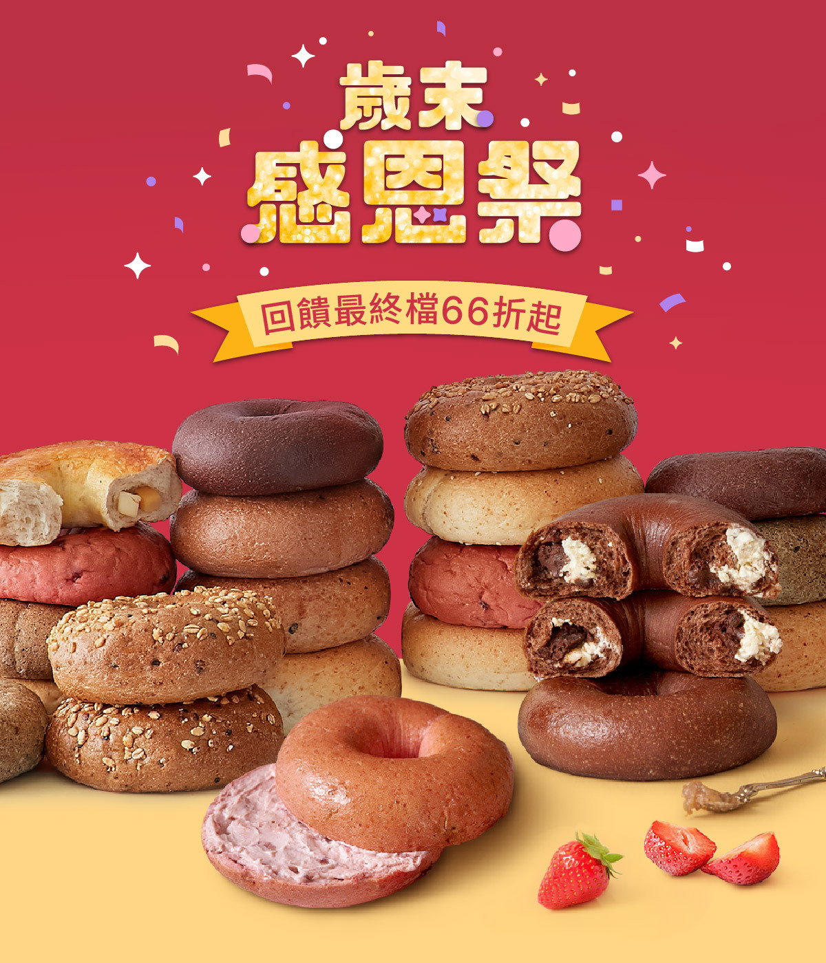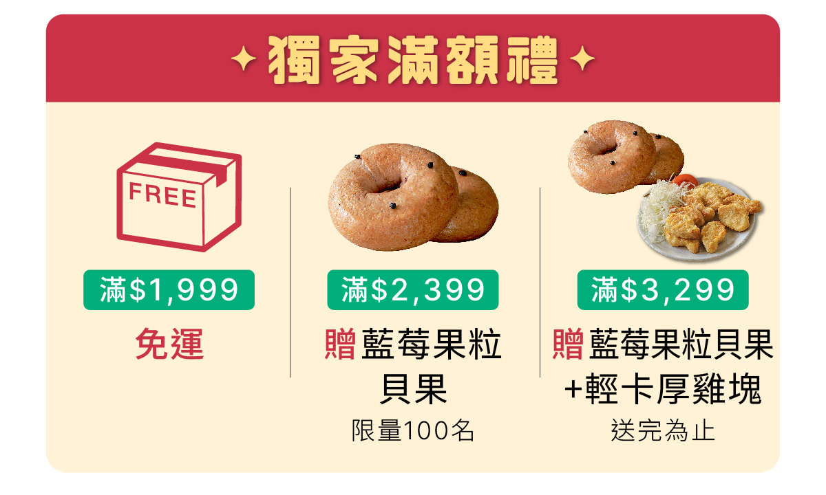 2.單筆消費折抵後滿$2,399免運再贈藍莓果粒貝果1入(限量100名)