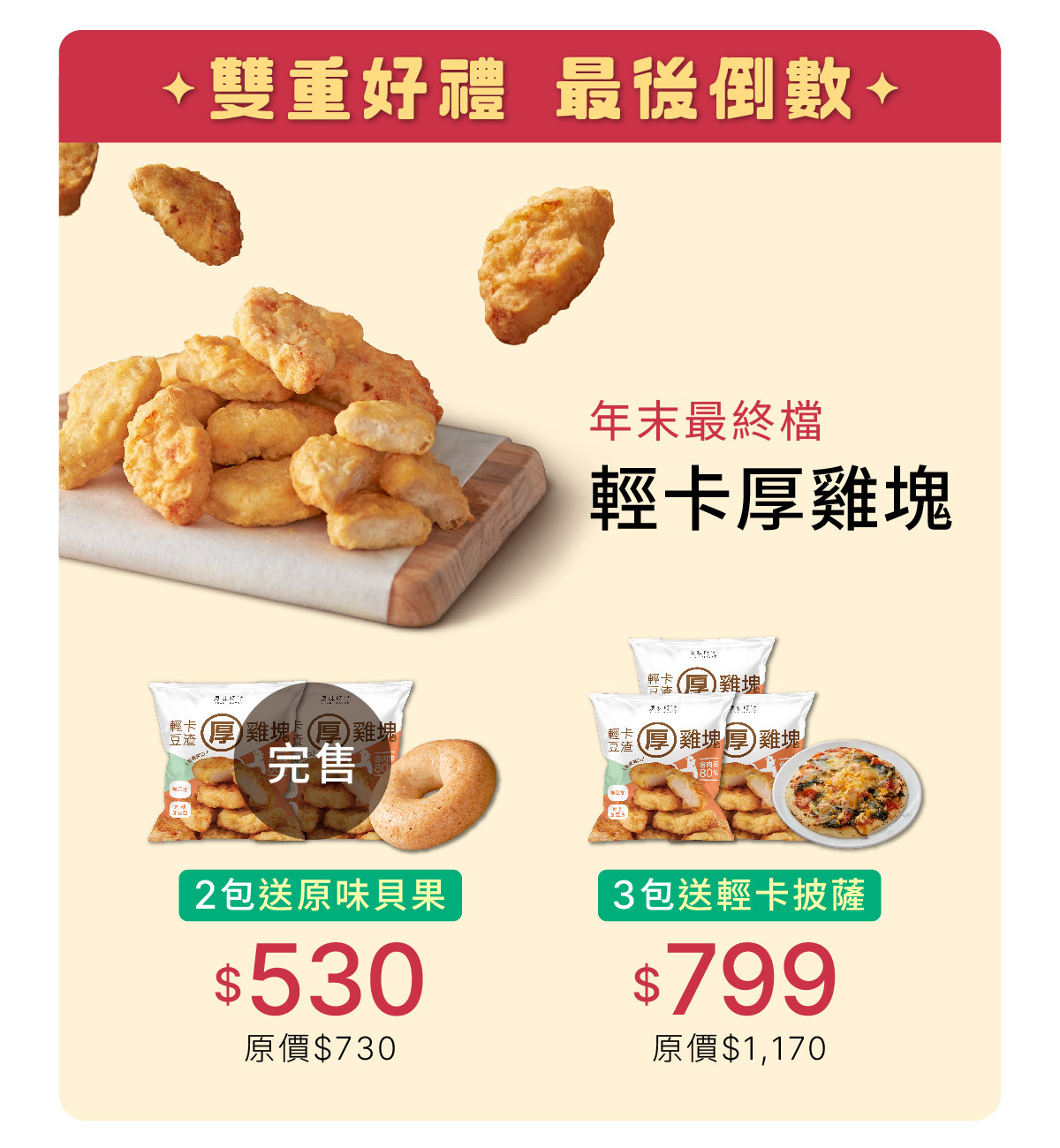 3.單筆消費折抵後滿$3,299贈輕卡厚雞塊1包+藍莓果粒貝果1入(送完為止)