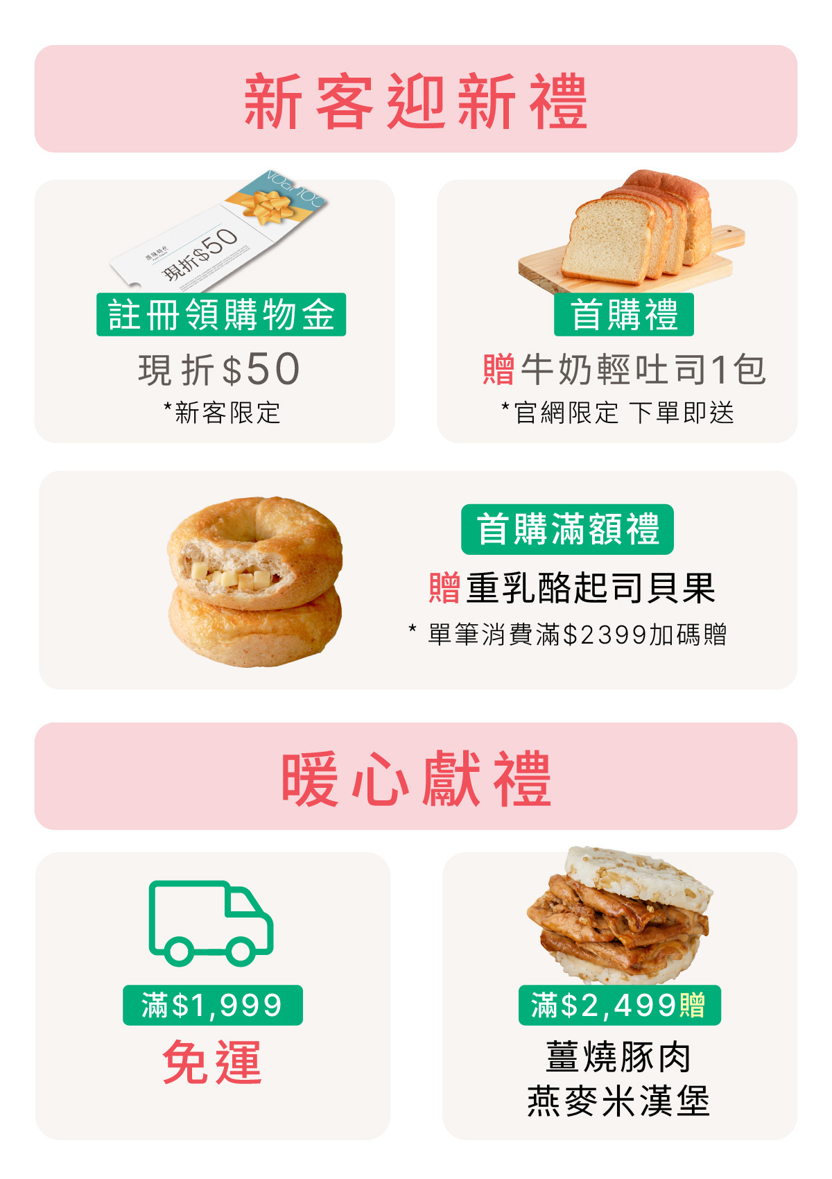 4.首購新客:單筆消費折抵後滿$2,399加碼贈重乳酪起司減醣貝果1入