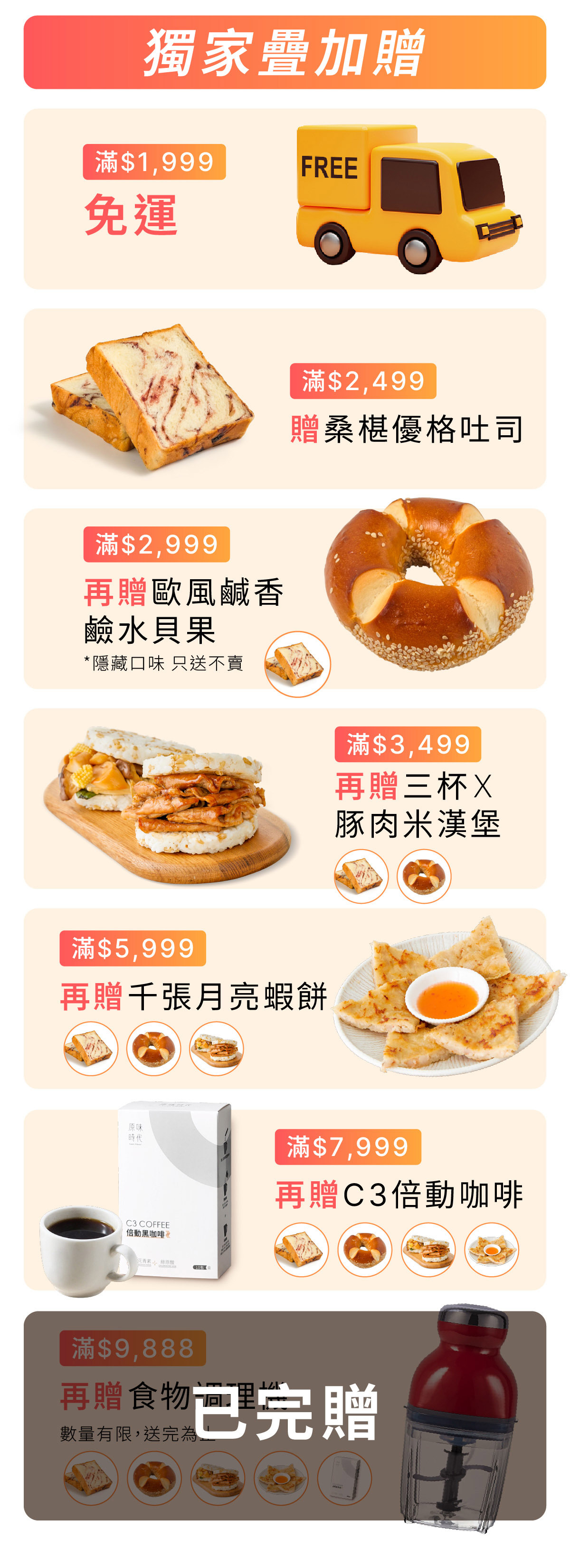 *贈品為冷凍商品限定,需登入會員、數量有限,隨時完贈,恕不另行通知,最終贈品請以購物車結帳頁面顯示為準,若未出現則代表已贈完。