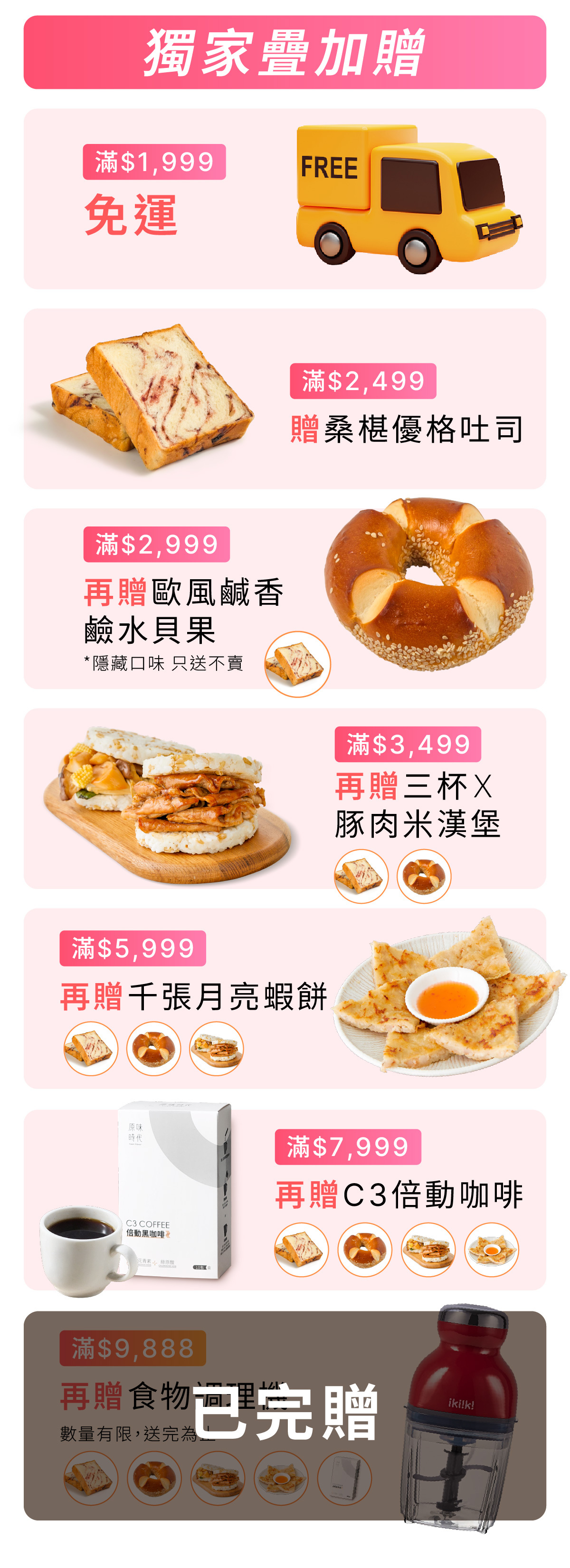 3.贈品為冷凍商品限定,需登入會員、數量有限,隨時完贈,恕不另行通知,最終贈品請以購物車結帳頁面顯示為準,若未出現則代表已贈完。