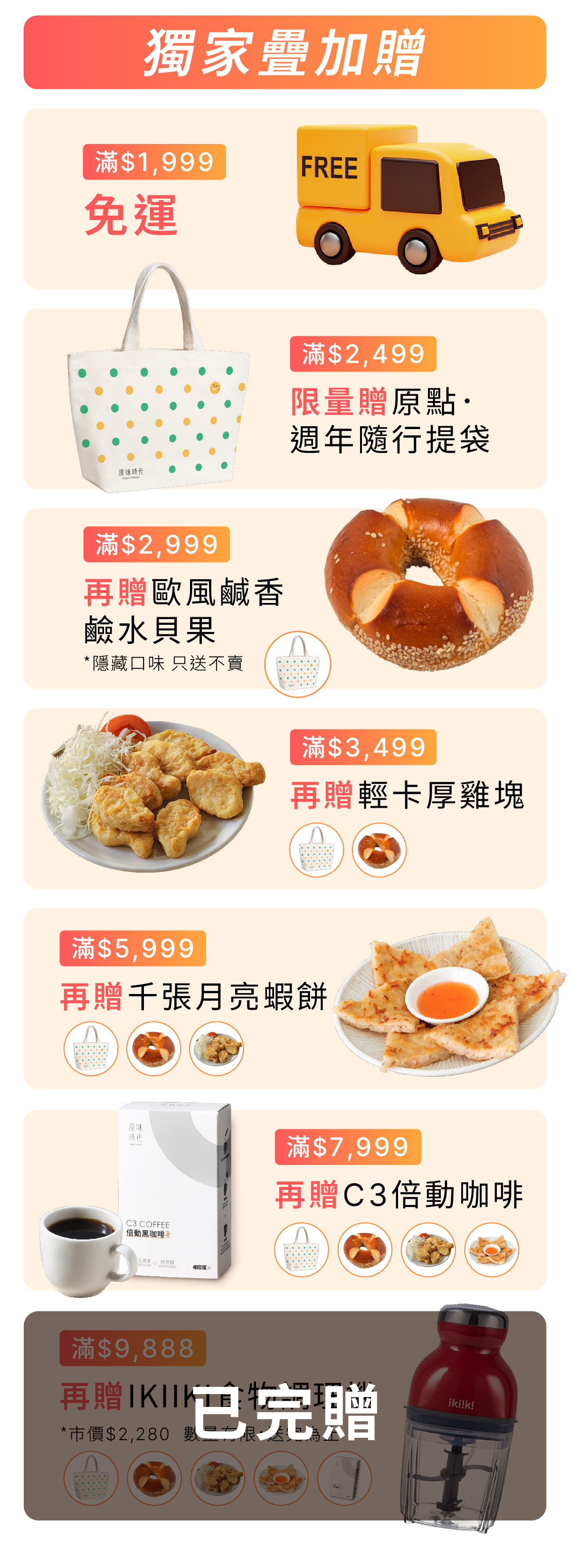 9.單筆消費折抵後滿$5,999再贈千張月亮蝦餅1入
