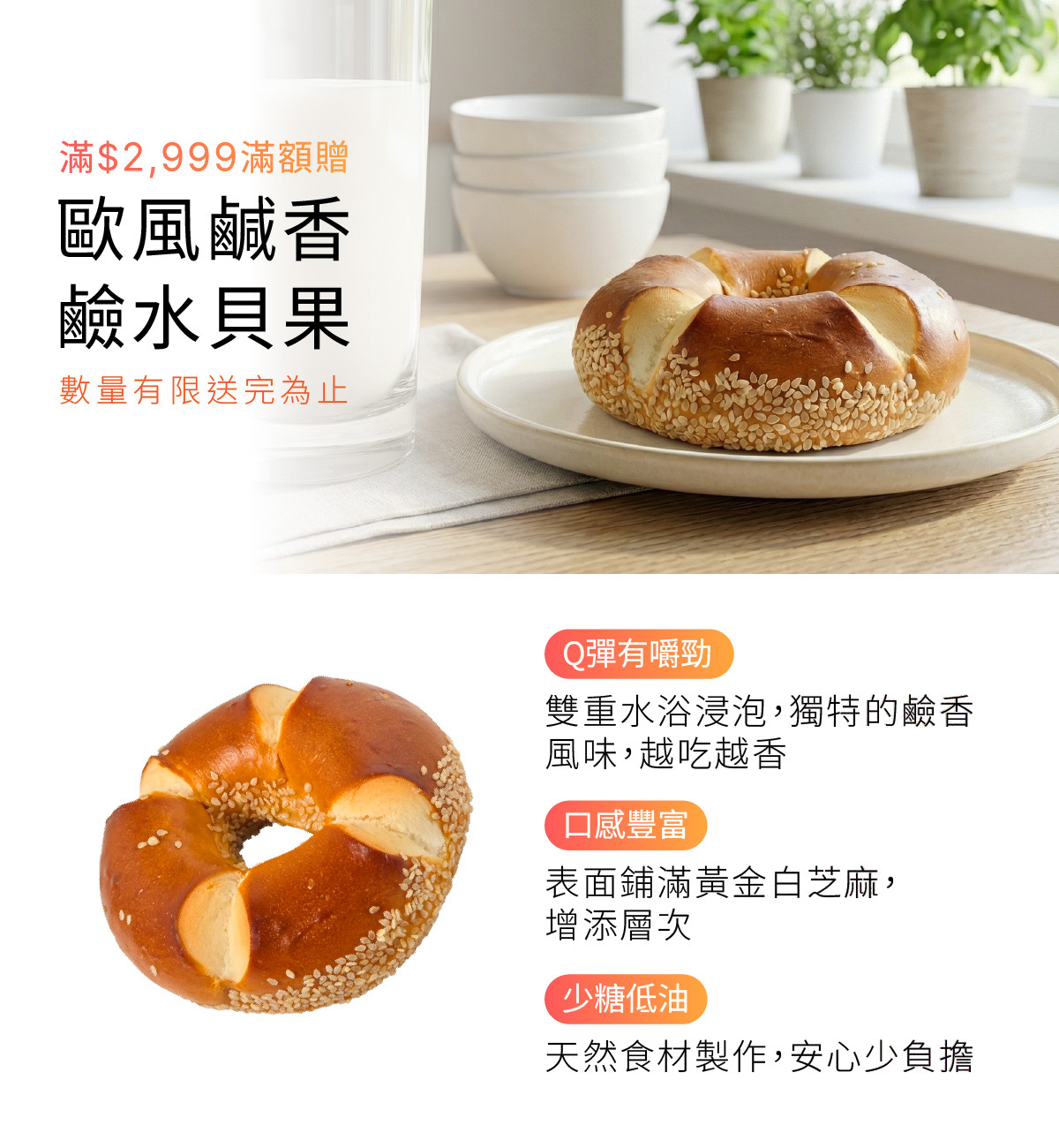 7.單筆消費折抵後滿$2,999再贈歐風鹹香鹼水貝果1入