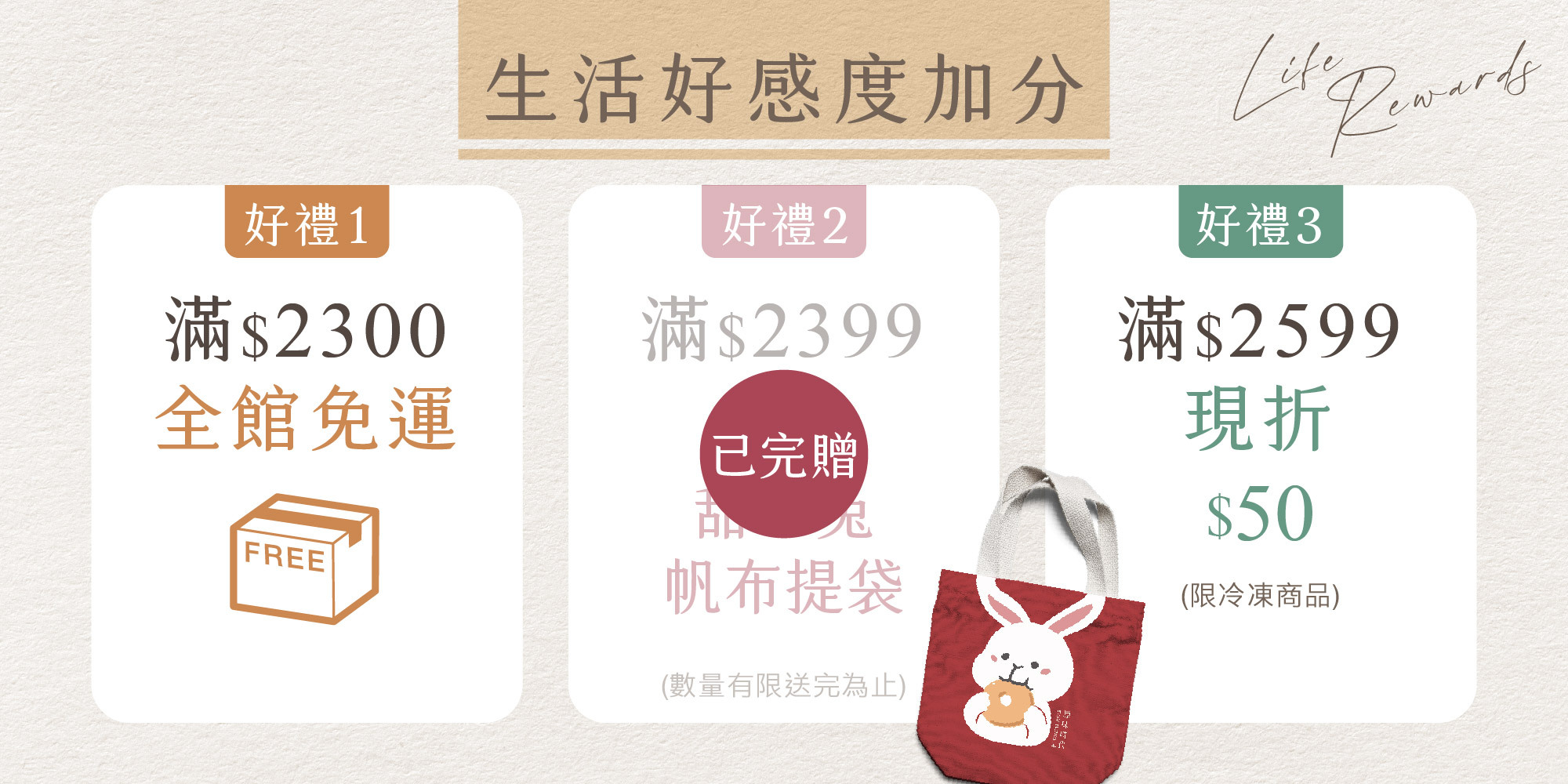 1.滿額贈優惠,單筆訂單折扣後消費滿$2399,即可獲得甜心兔帆布提袋乙個,數量有限,送完為止,恕不累贈