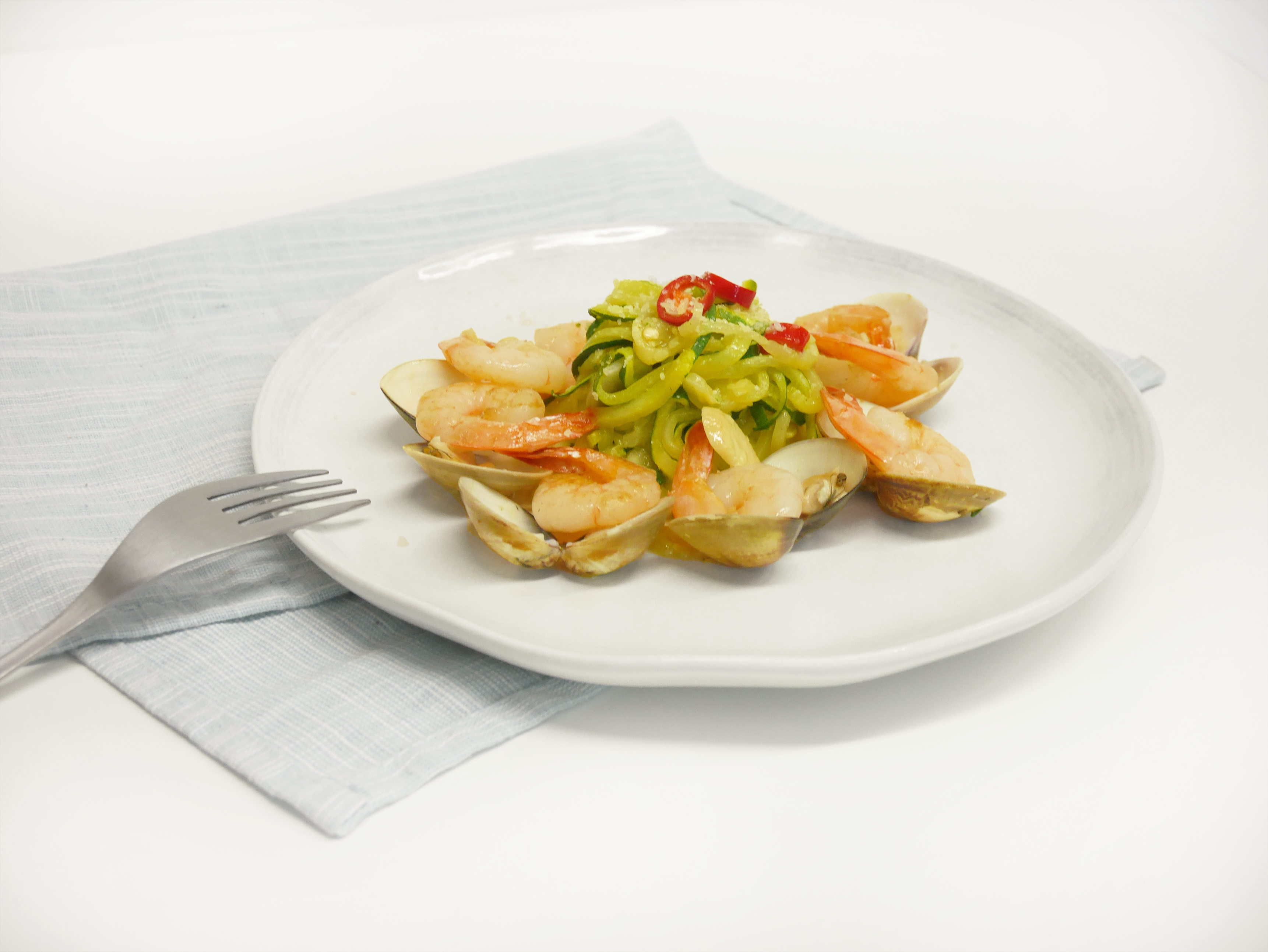悶熱夏天最擔心食慾不佳,吃不下太負擔的料理!今天推薦一道簡單又清爽的夏日減醣料理,以口感輕盈爽脆的櫛瓜取代精緻澱粉所製的義大利麵,不只減少碳水攝取,更提供高纖維、維生素A、C等營養價值;蝦仁及蛤蜊的鮮味與櫛瓜的自然甜味相輔相成,令人胃口大開!
