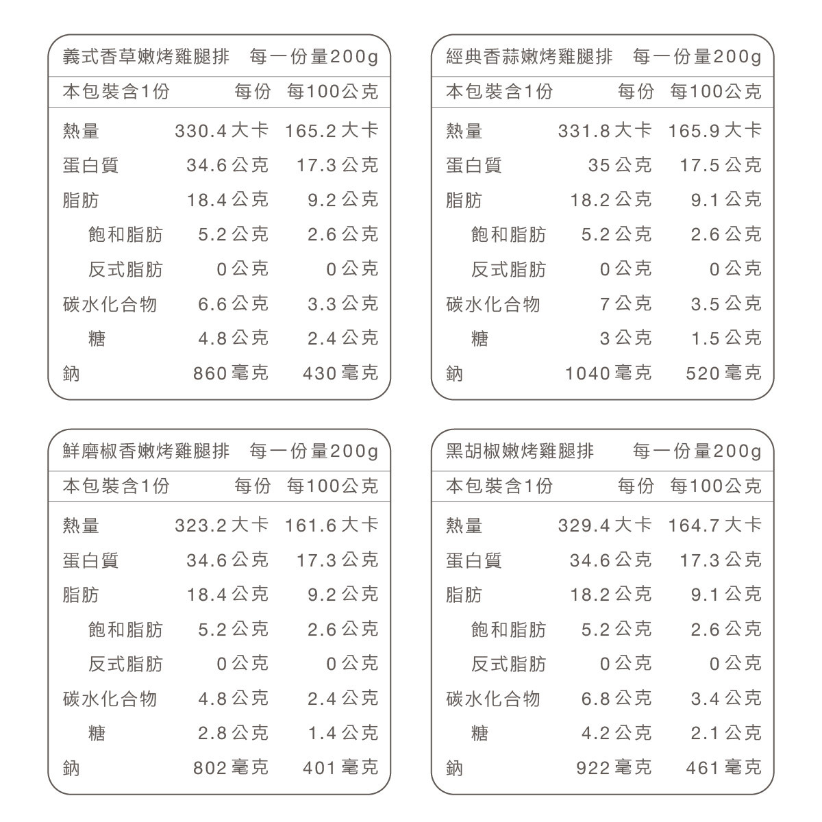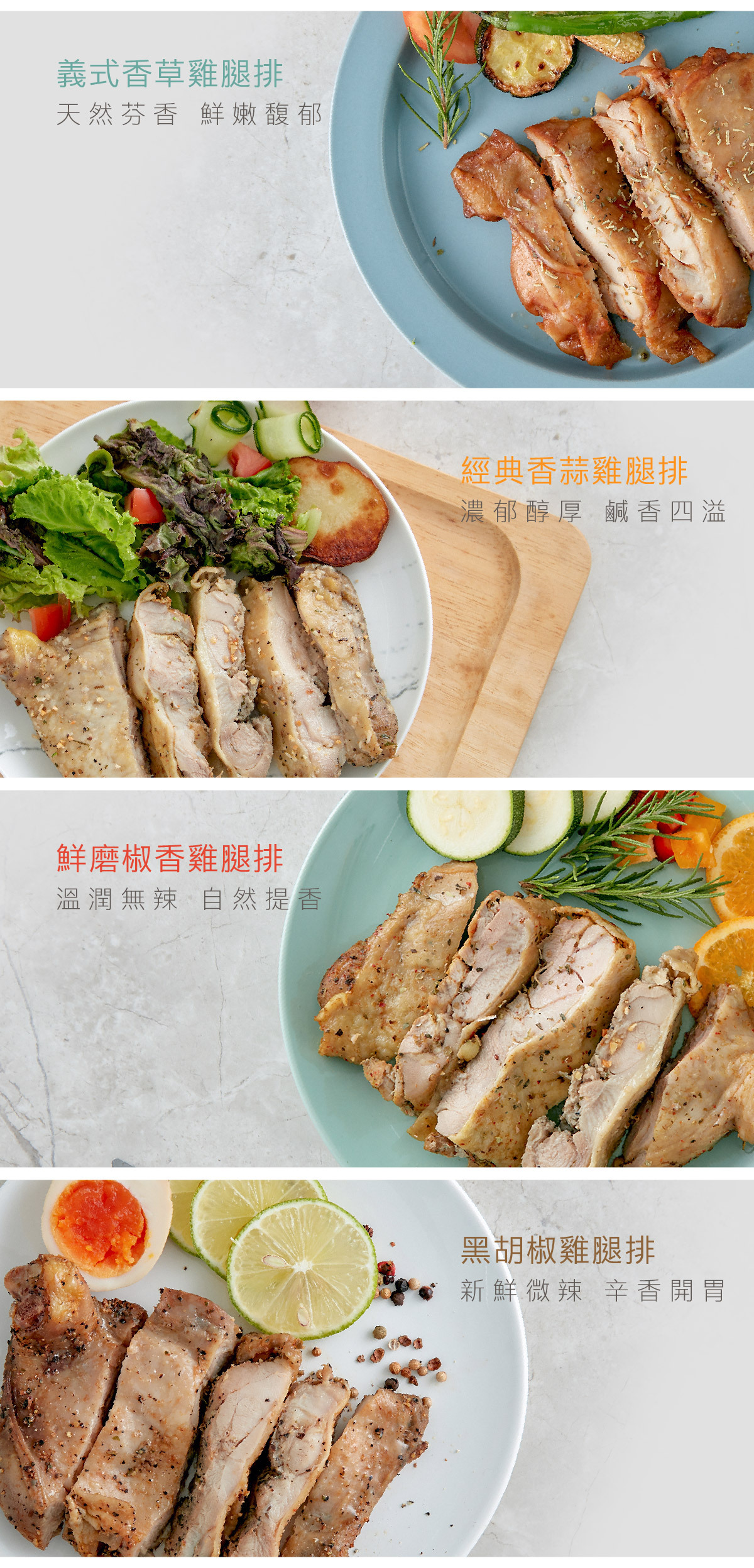 去骨雞腿肉、蒜頭、綜合辛香料【大蒜、洋蔥、鹽、香辛料(黑胡椒、巴西里香芹、辣椒、紅椒)、橙皮、青椒】、糖、鹽、蒜粉、白胡椒粉