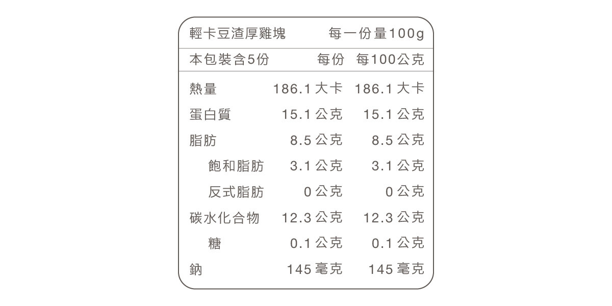 雞胸肉(組合)、豆渣、雞皮、麵粉、玉米澱粉(非基改)、樹薯澱粉、食鹽、砂糖、、蒜粉、白胡椒粉、葡萄糖、小蘇打、芹菜粉、