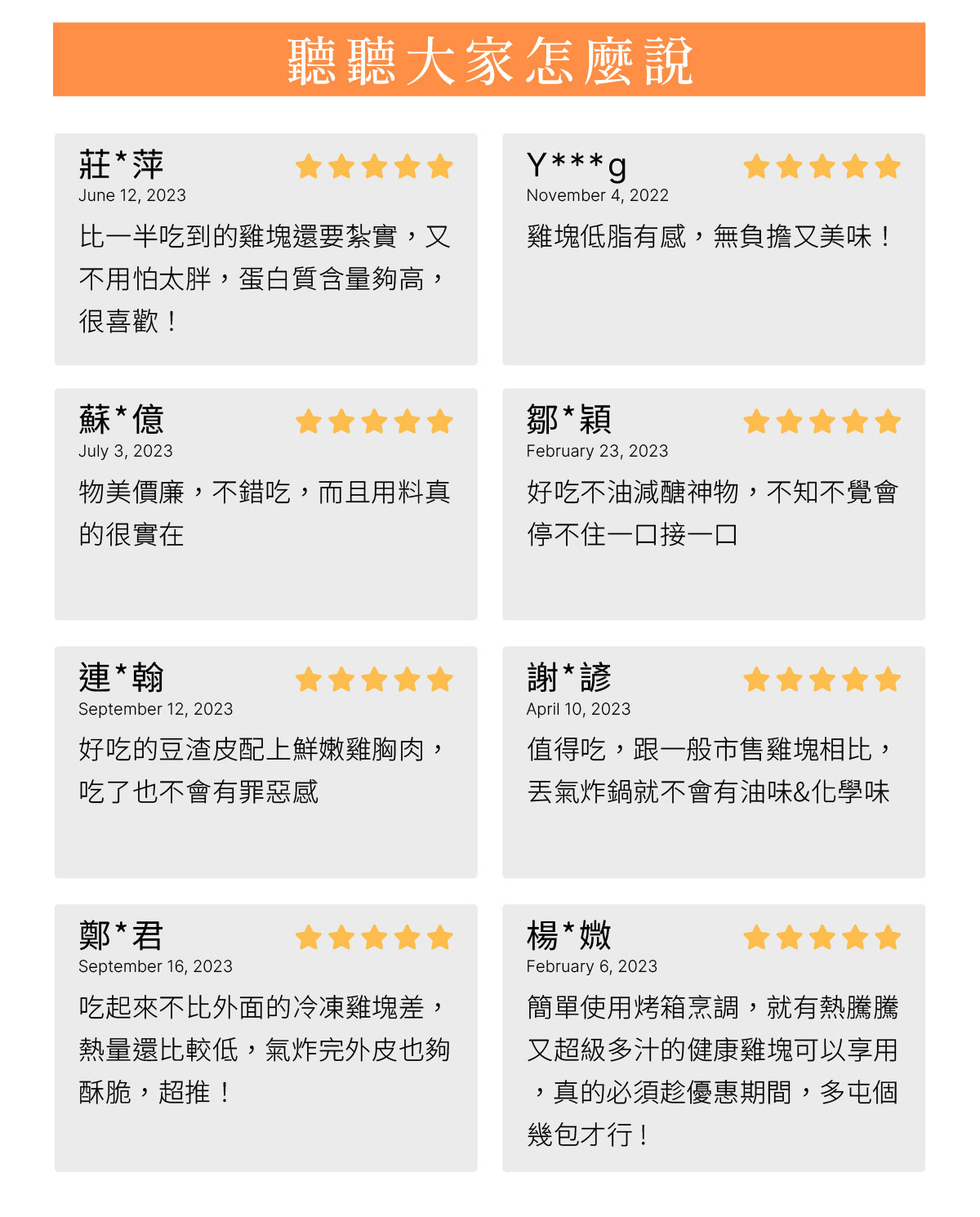 雞胸肉(組合)、豆渣、雞皮、麵粉、玉米澱粉(非基改)、樹薯澱粉、食鹽、砂糖、、蒜粉、白胡椒粉、葡萄糖、小蘇打、芹菜粉、