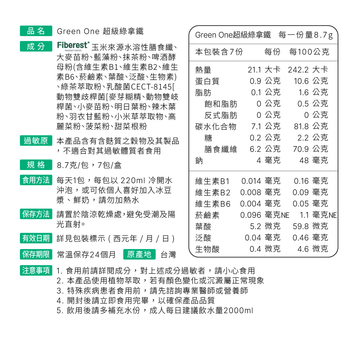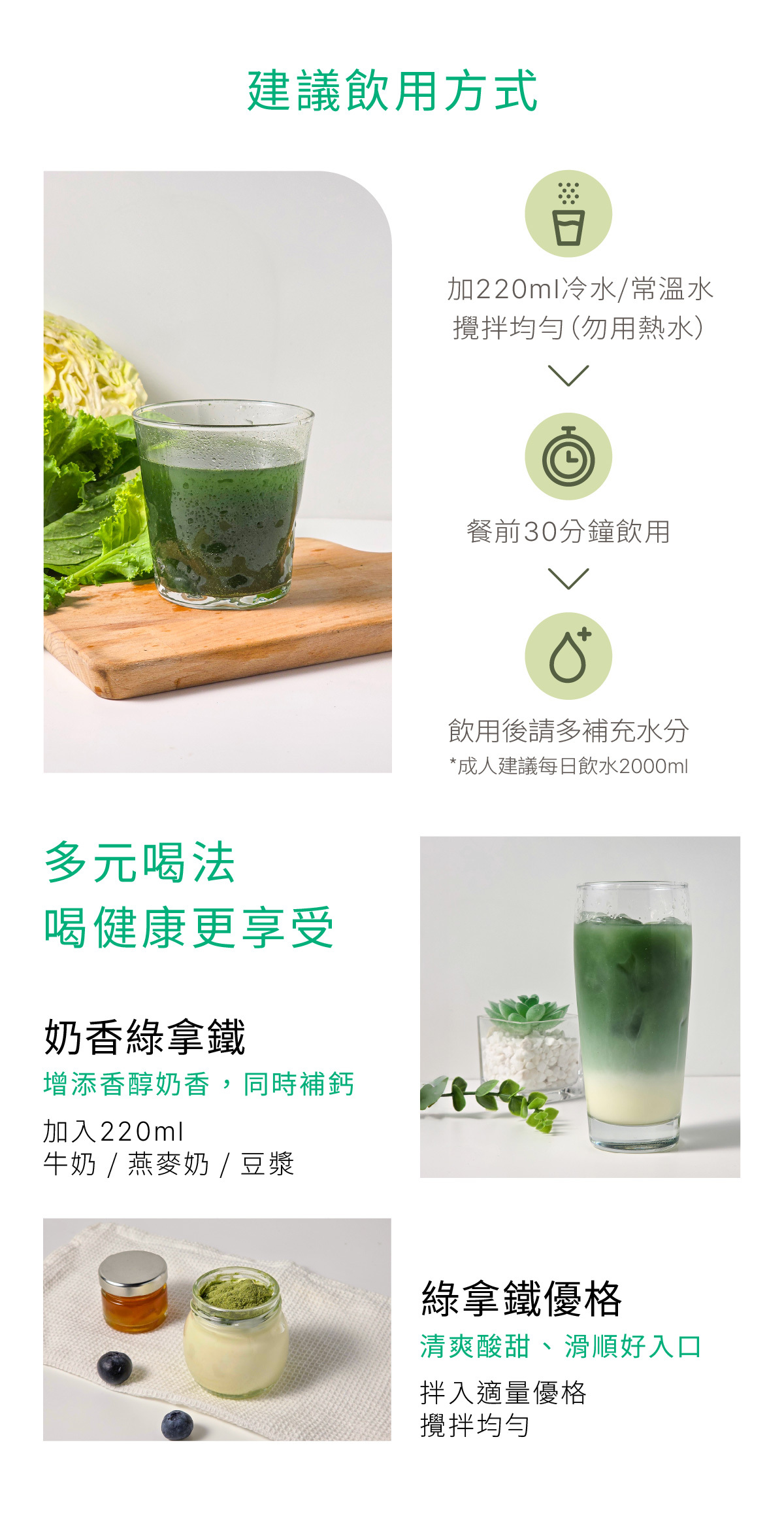 飲用|每日1-2包+220ml常溫水/冷水,餐前30分鐘飲用,並補足水量2000ml