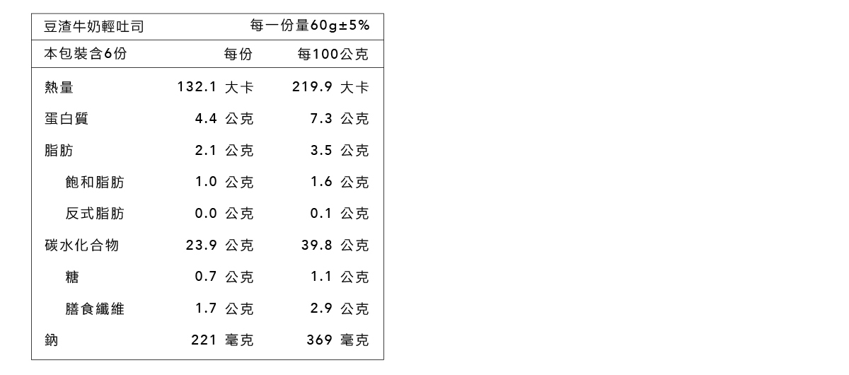 豆渣牛奶輕吐司:麵粉、水、非基改豆渣、赤藻糖醇、無鹽奶油、牛奶、酵母、鹽