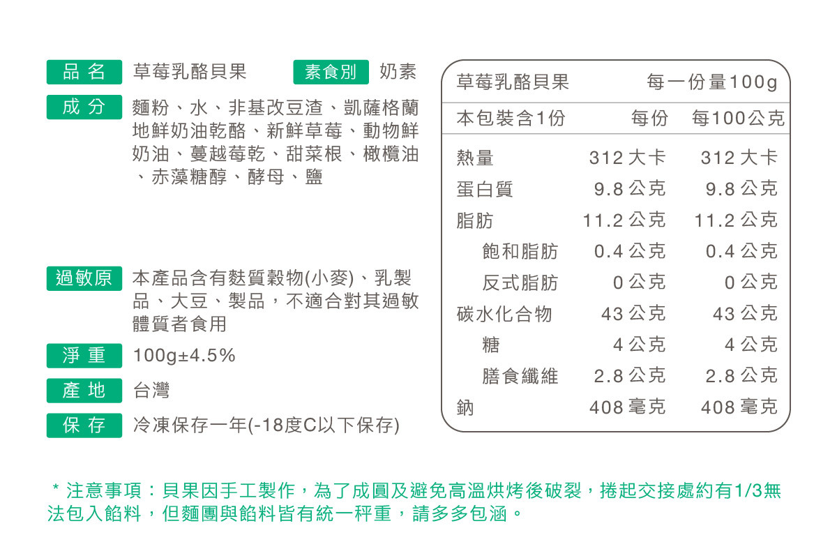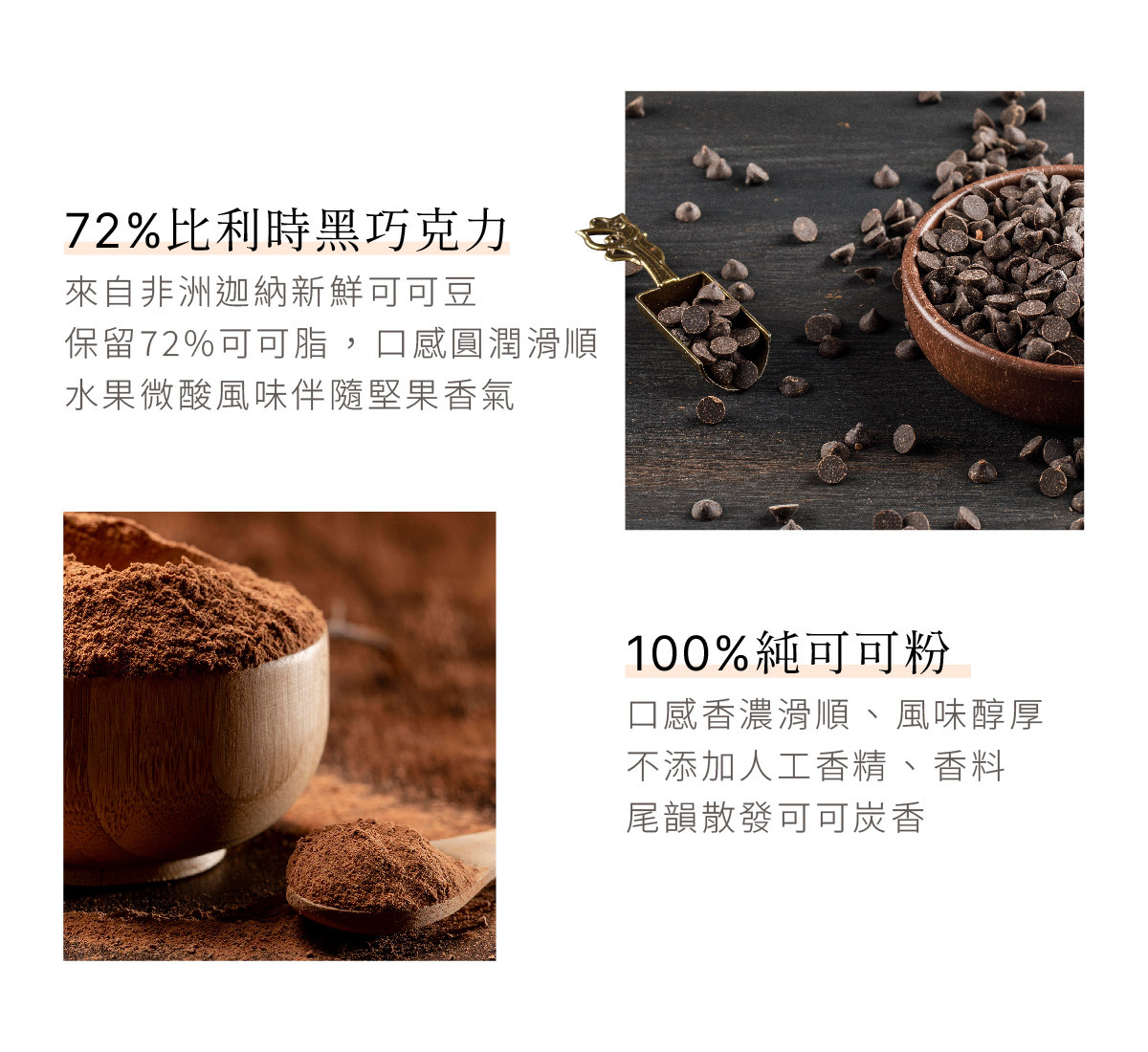 麵粉、水、非基改豆渣、凱薩格蘭地鮮奶油乾酪、香蕉泥(香蕉、海藻糖、糖)、黑巧克力豆、法芙娜苦味巧克力、赤藻醣醇、可可粉、鹽、橄欖油、酵母