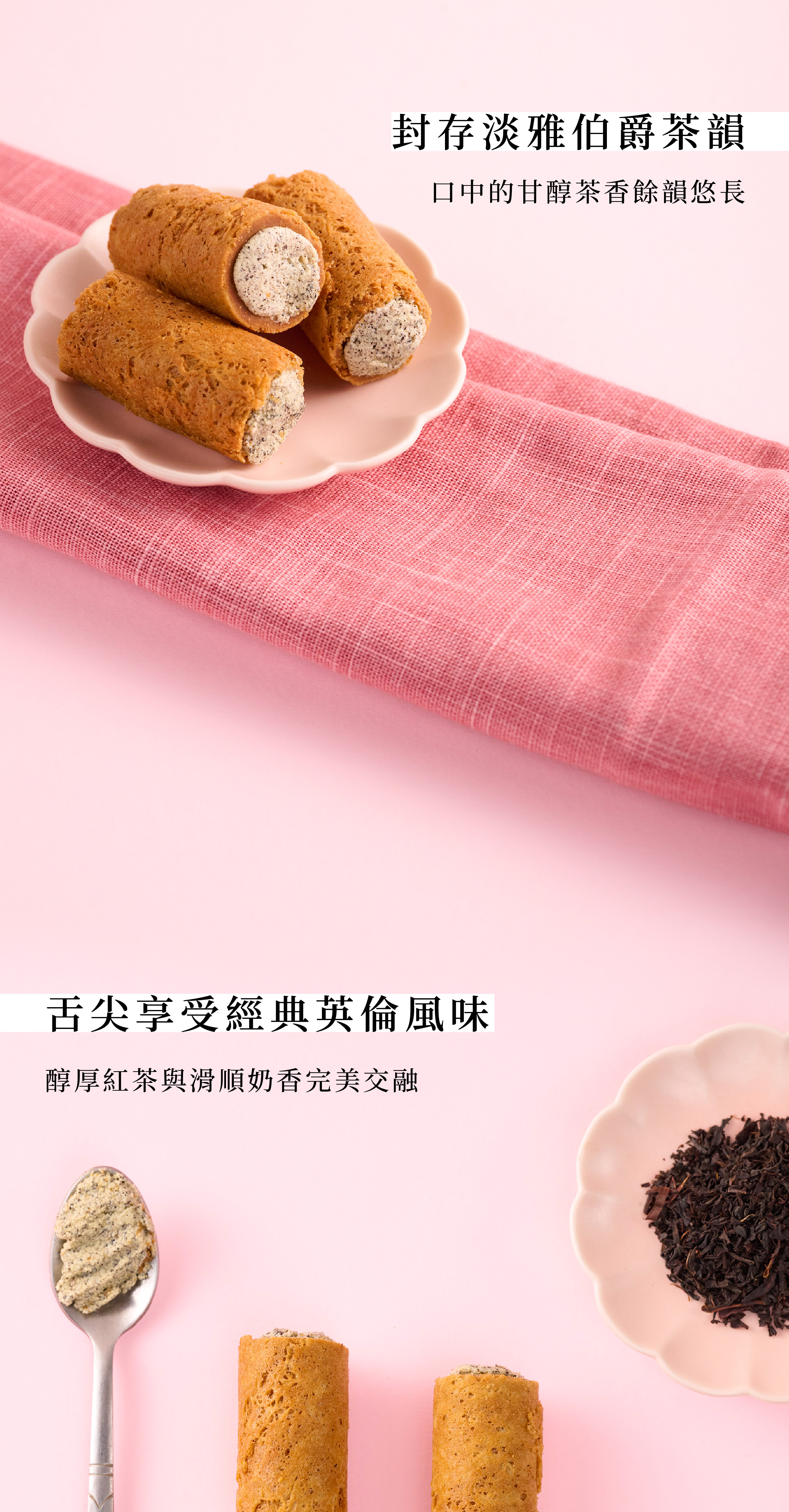 選用英國經典唐寧茶,揉合醇厚紅茶與淡雅佛手柑芬芳,每一口吃得到優雅清香