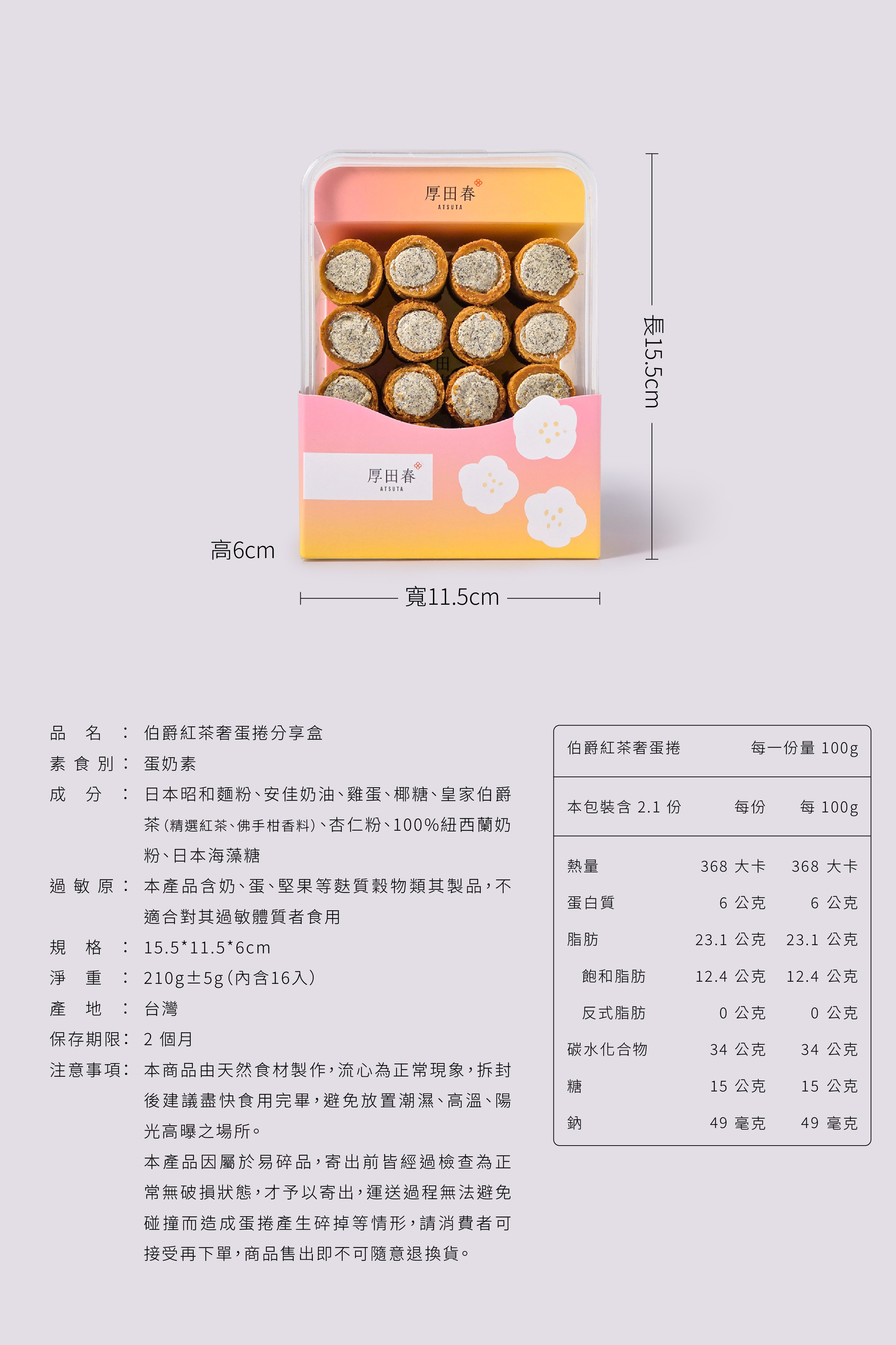 產品成分:日本昭和麵粉、安佳奶油、雞蛋、椰糖、皇家伯爵茶(精選紅茶、佛手柑香料)、杏仁粉、100%紐西蘭奶粉、日本海藻糖