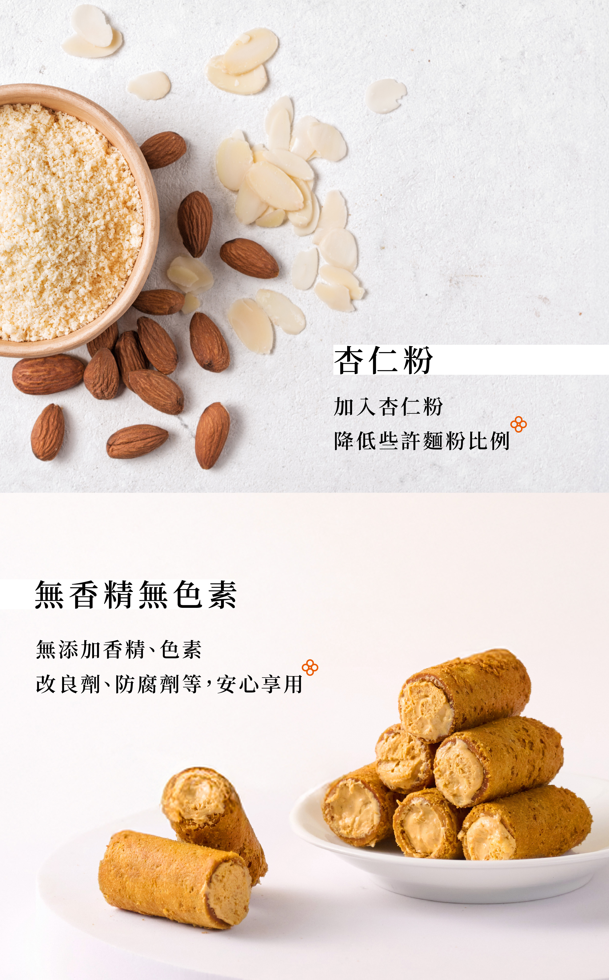 蛋捲獨家使用天然椰糖,搭配日本昭和薄力粉、安佳無水奶油,酥脆細緻更散發淡淡焦糖香