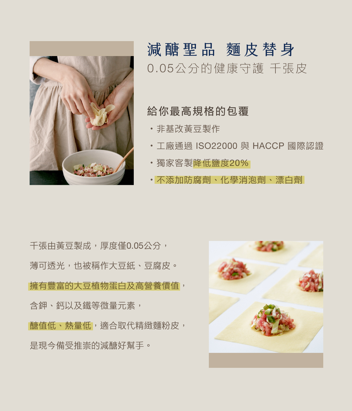 高麗菜、豬絞肉、千張豆皮(非基改黃豆、非基因改造大豆蛋白、甘油、鹽)、香油(大豆油、芝麻油)、水、醬油、青蔥、薑、紅糖、鹽、酵母萃取物