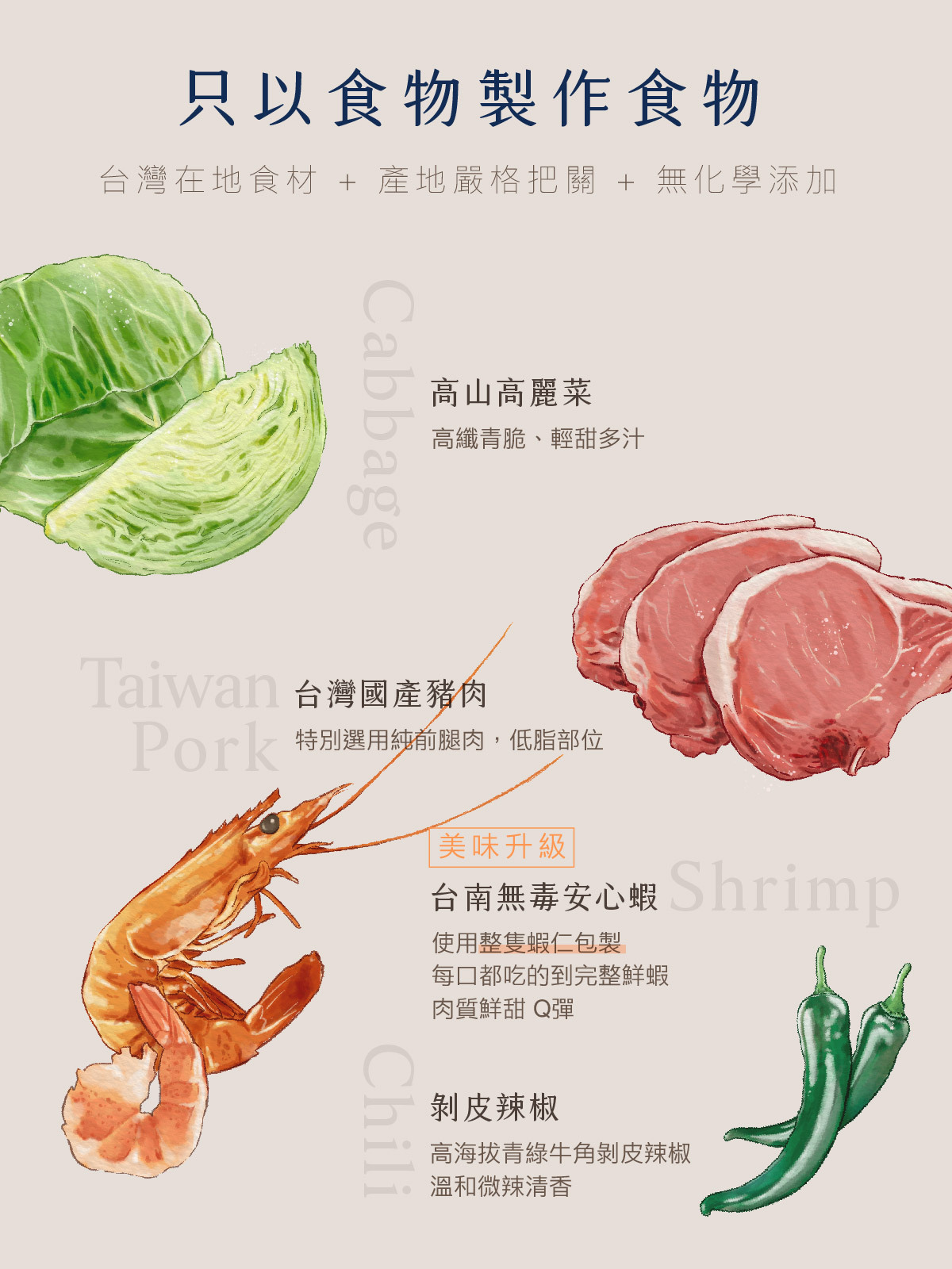 高麗菜、豬絞肉、蝦仁、千張豆皮(非基改黃豆、非基因改造大豆蛋白、甘油、鹽)、香油(大豆油、芝麻油)、水、醬油、青蔥、薑、紅糖、鹽、酵母萃取物
