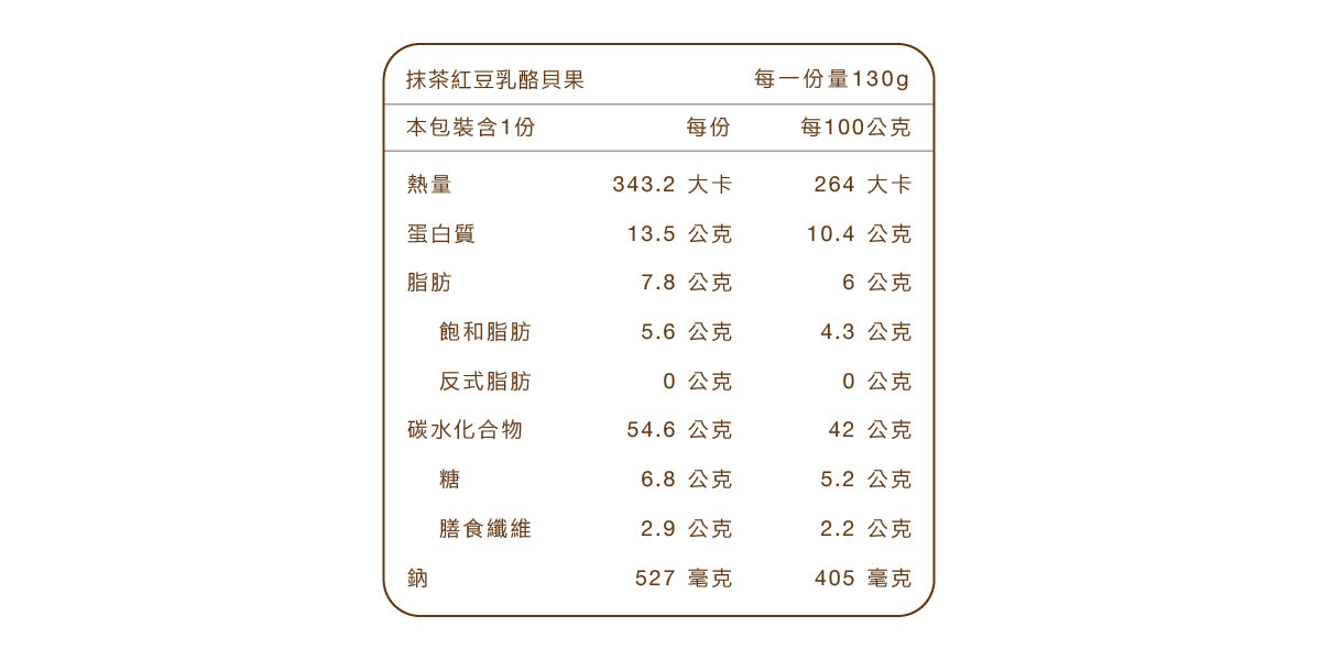 麵粉、水、非基改豆渣、奶油乾酪、西尾抹茶粉(日本鹿兒島)、紅豆泥(紅豆、糖)赤藻醣醇、鹽、橄欖油、酵母