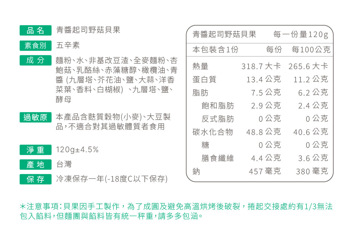 麵粉、水、非基改豆渣、全麥麵粉、杏鮑菇、乳酪絲、赤藻糖醇、橄欖油、青醬 (九層塔.芥花油.鹽.大蒜.洋香菜葉.香料.白楜椒) 、九層塔、鹽、酵母