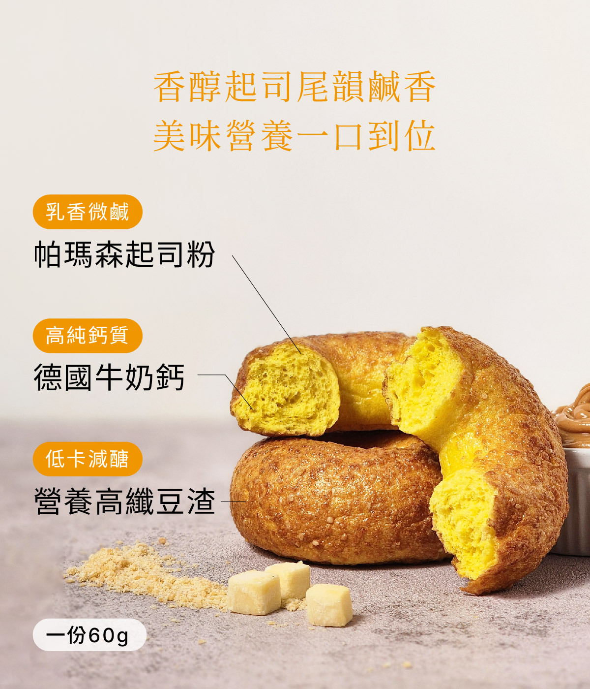 ✓高纖豆渣:非基改大豆製成,部分取代高熱量麵粉