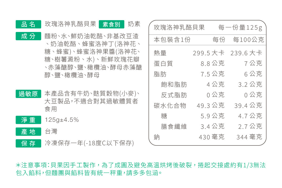 麵粉、水、鮮奶油乾酪(牛奶、乳脂、鹽、 刺槐豆膠、關華豆膠、乳酸菌)、非基改豆渣、蜂蜜洛神丁(洛神花、糖、蜂蜜)、蜂蜜洛神果醬(洛神花、糖、樹薯澱粉、水)、新鮮玫瑰花瓣、蔓越莓乾、赤藻醣醇、鹽、橄欖油、酵母