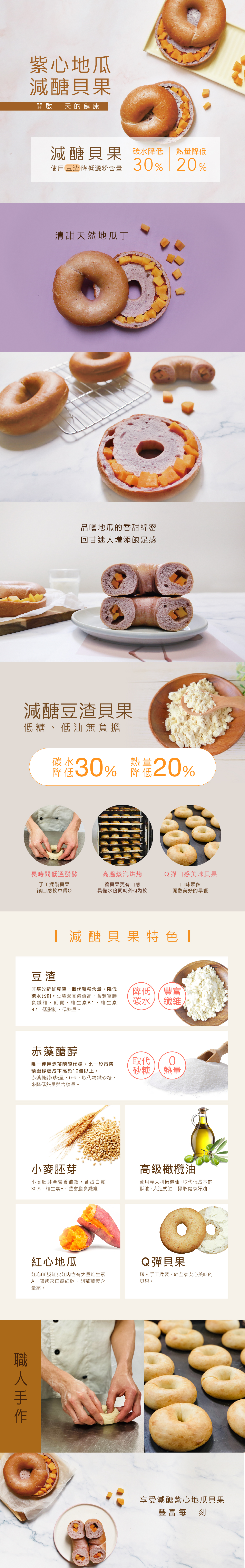 麵粉、水、非基改豆渣、小麥胚芽、紅薯粉(紫心甘薯)、地瓜紅丁(紅地瓜、糖、水)、赤藻醣醇、橄欖油、酵母、鹽