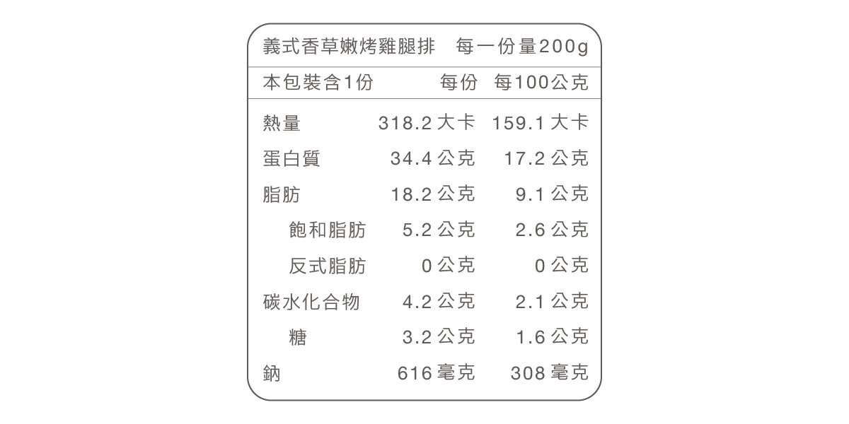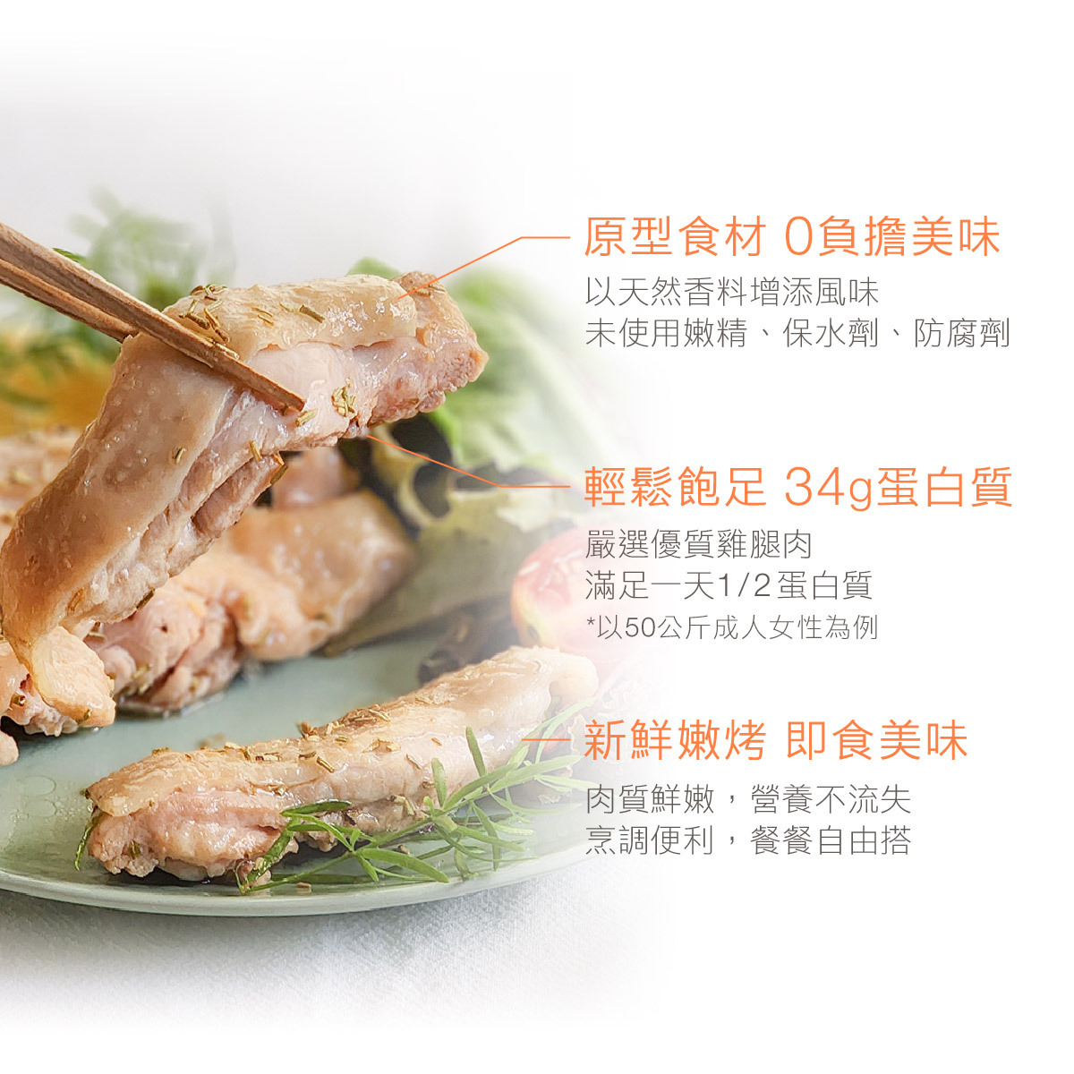 去骨雞腿肉、法式迷迭香醃料【糖、鹽、義大利香料〔羅勒葉、俄利岡葉、牛膝草葉、迷迭香、月桂葉、洋香菜葉】、水解植物蛋白(水解黃豆蛋白、麥芽糊精、鹽)、咖哩粉(胡荽、薑黃、小茴香、陳皮、苦豆、胡椒、荳蔻、蒜、辣椒、月桂葉、二氧化夕)、大蒜、迷迭香、花椒、白胡椒、九層塔抽出物、天然紅椒色素(紅椒色素、葵花油】